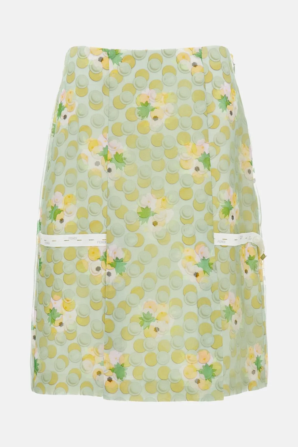 Midi skirt in organza with floral print Panel construction Double-layer fabric Elastic logo detail on the front Two front slits Side zip fastening Color: green Made in Italy Details and Care Color: Verde Composition: 100%SE Made in: Italia Sku: FQ7721AW9SF1AL8