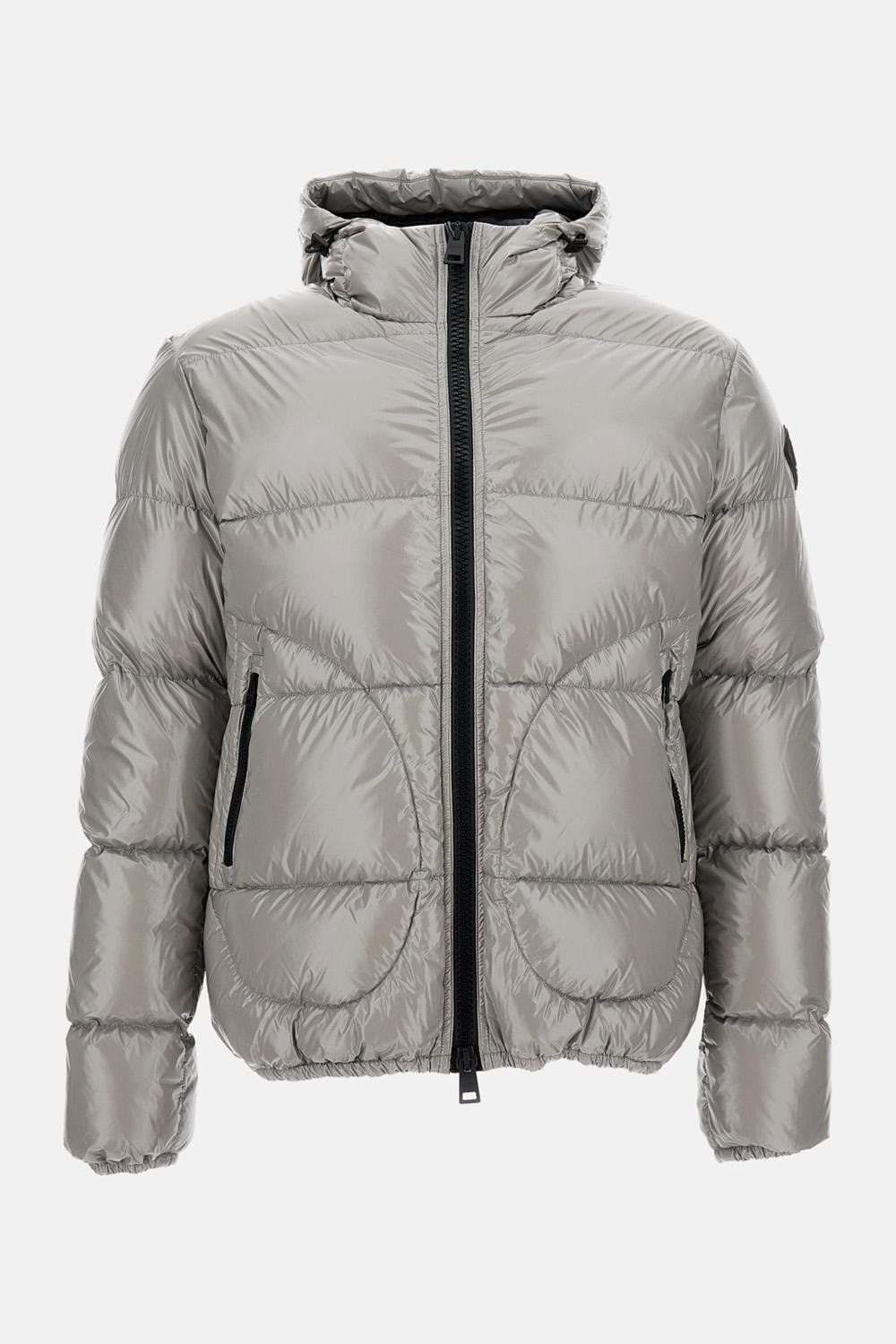 High neck bomber jacket with hood, front zip fastening, side pockets, grey colour. Regular fit Care and details Color: Grey Composition: 100% PA Made in: Armenia Code: PI001133U12220Z9406