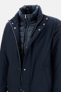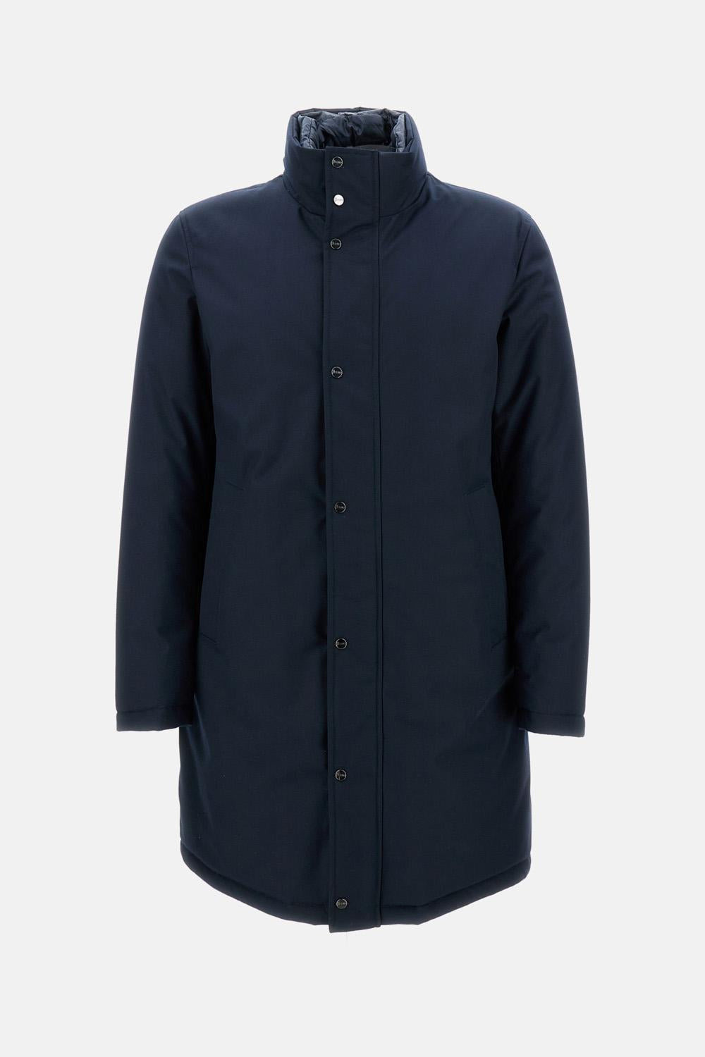 Coat with removable bib with double-slider zip for greater versatility Technical fabric with brushed effect High collar and covered closure with zip + snap buttons Side welt pockets Goose down padding: ideal thermal comfort for mid-season Regular fit Color: blue. Details and Care Color: Blu Composition: 80% PL 20% VI Made in: Romania Sku: PI001192U126389200