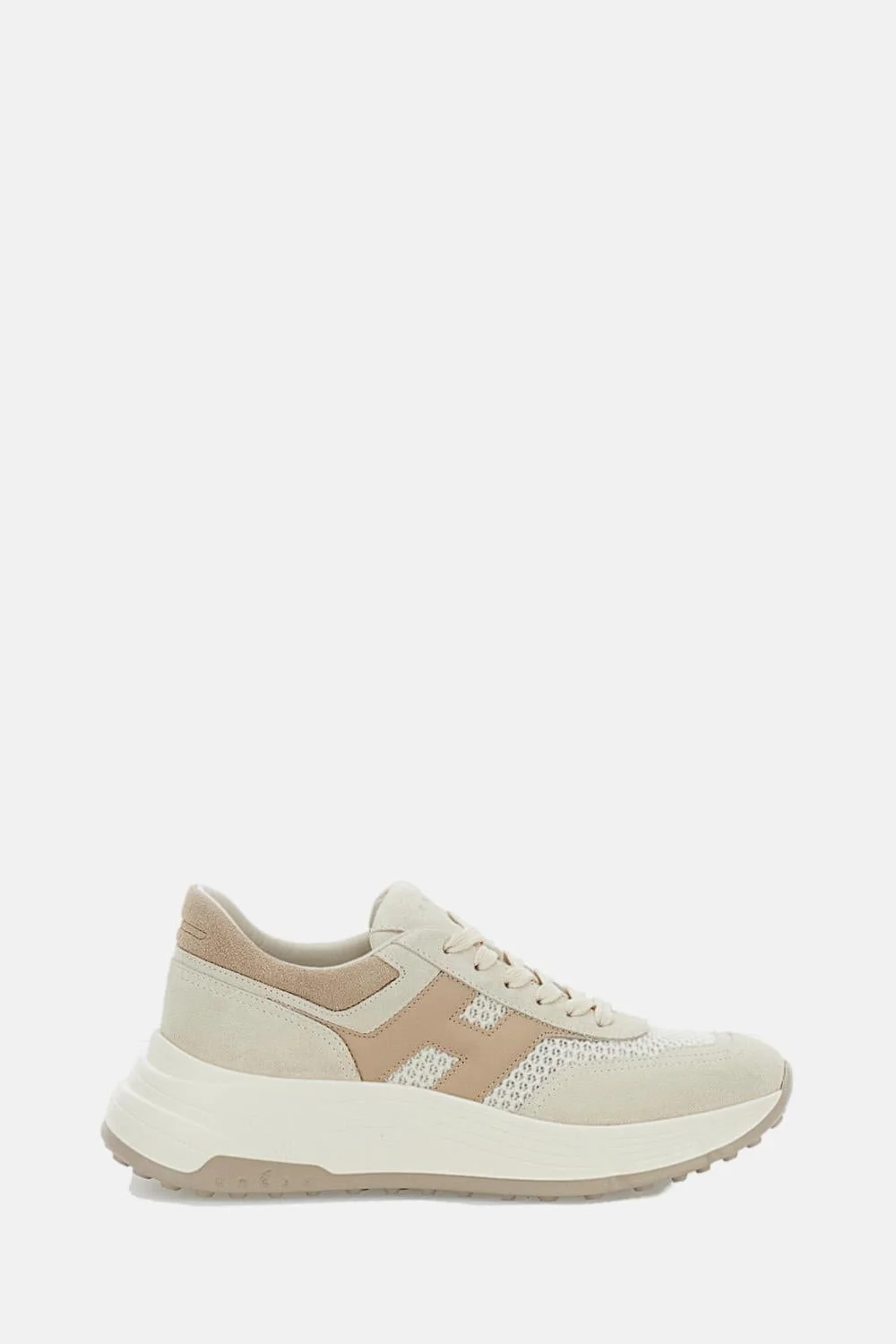 Beige suede leather upper Technical fabric inserts Contrasting smooth leather details Cut-out side "H" Cotton lace closure Logo tongue Rubber sole Includes an extra pair of laces Made in Italy Details and Care Color: Beige Composition: 55% TEX 45% CALFSKIN Made in: Italia Sku: HXW6690GA70UZV0RVY