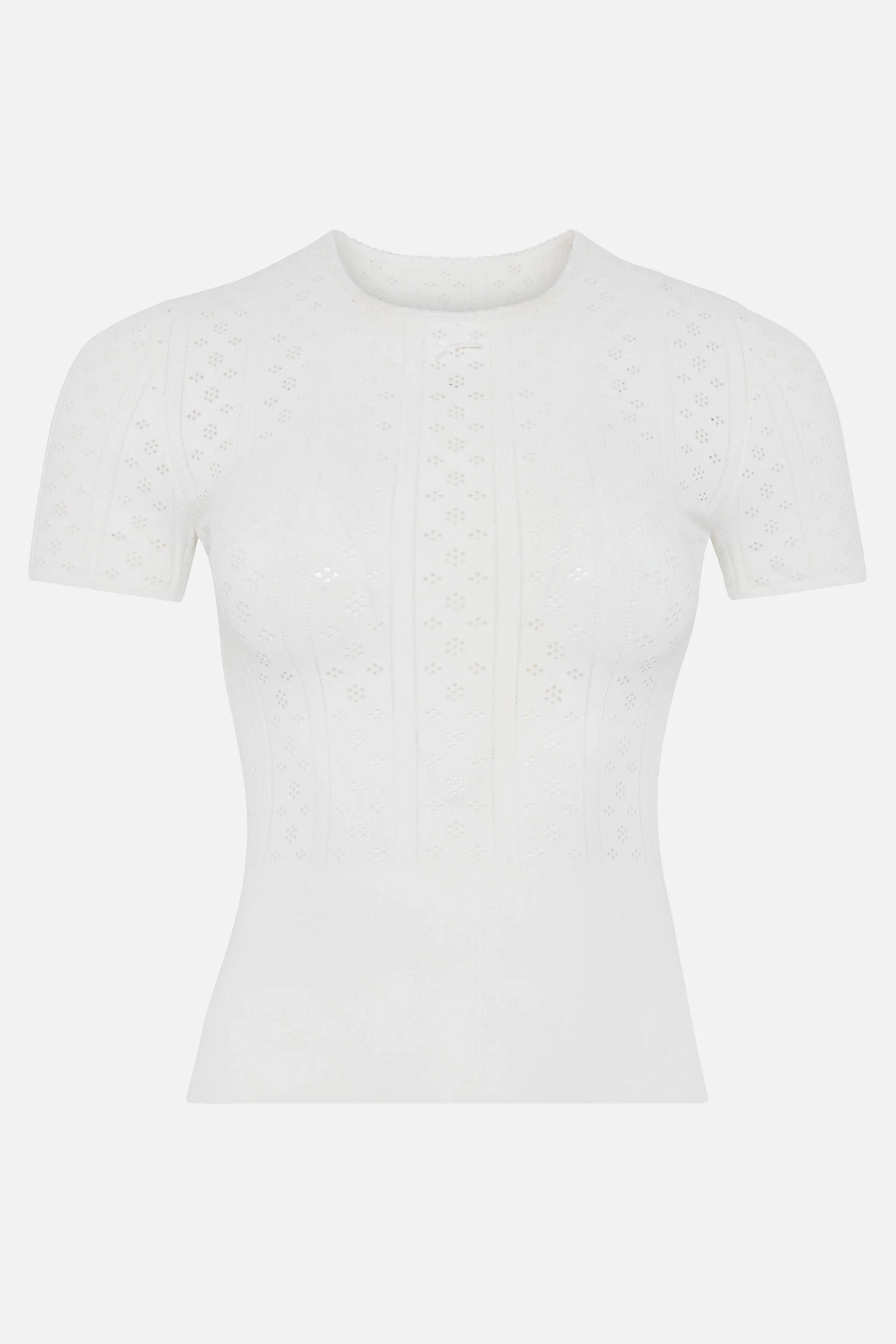 Crewneck T-shirt crafted in white stretch technical viscose pointelle knit. Scalloped edge on the neckline and finishing with a decorative bow. Fitted silhouette. Details and Care Color: Bianco Composition: 66% VISCOSE, 19% POLYAMIDE, 13% POLYESTER, 2% ELASTANE Made in: Cina Sku: KW1477YN0309002