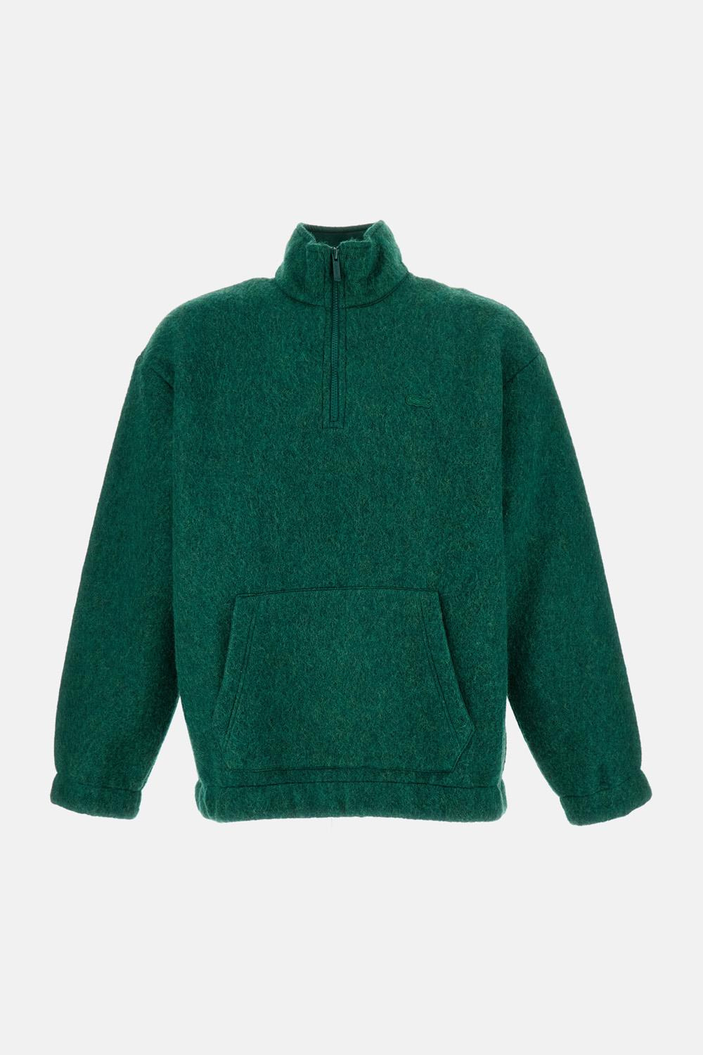Lacoste sweatshirt with half zip. Made of wool blend. Green color. Front kangaroo pocket. Comfortable and functional fit. Iconic Lacoste logo on the chest Details and Care Color: Verde Composition: 40% PL 23% PC 23% WO 14% VI Made in: Turchia Sku: SH5463132