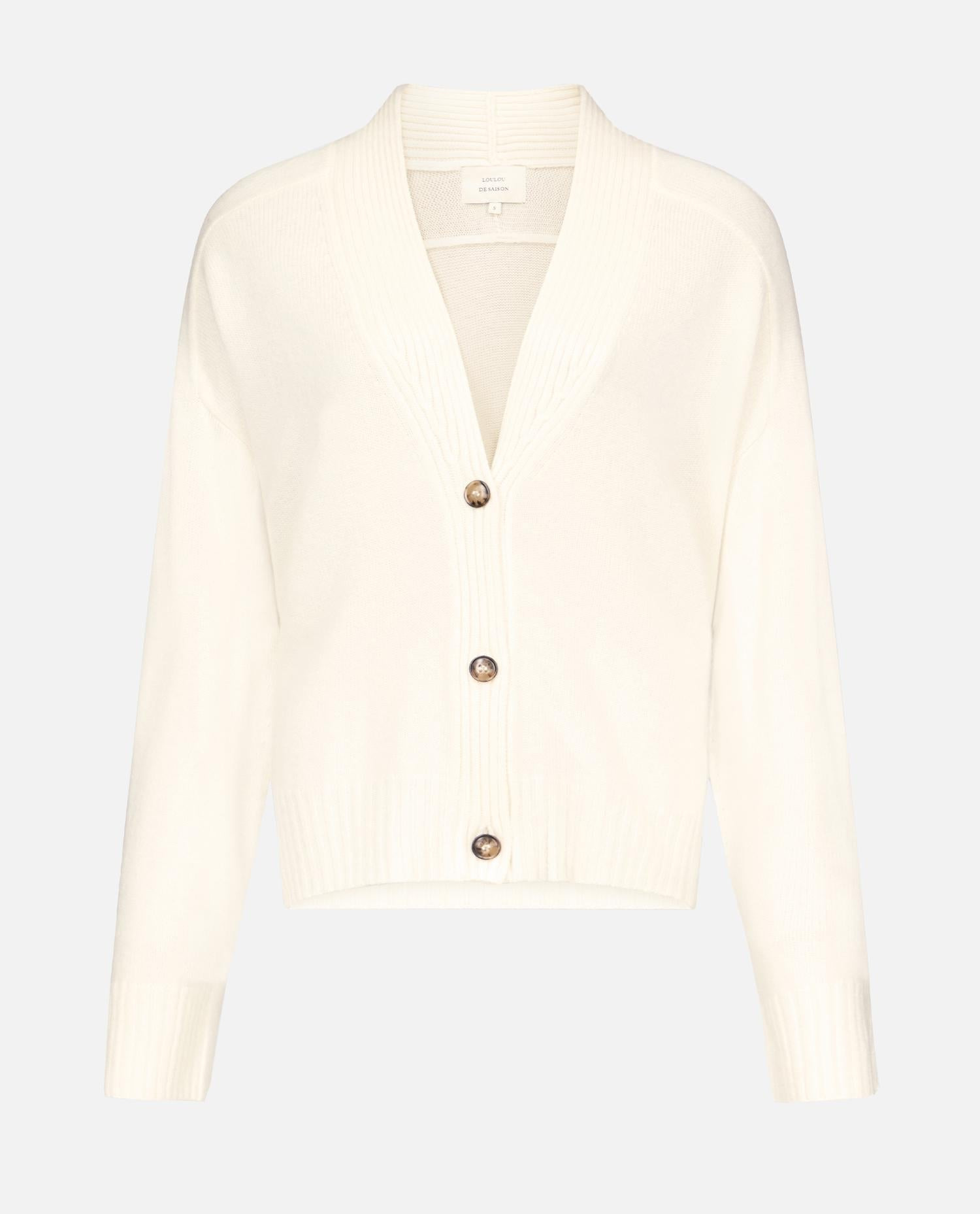 V-neck cardigan. Long sleeves. Button closure. Color: cream Details and Care Color: Bianco Composition: 100% WS Made in: Cina Sku: KAIALDSIVORY