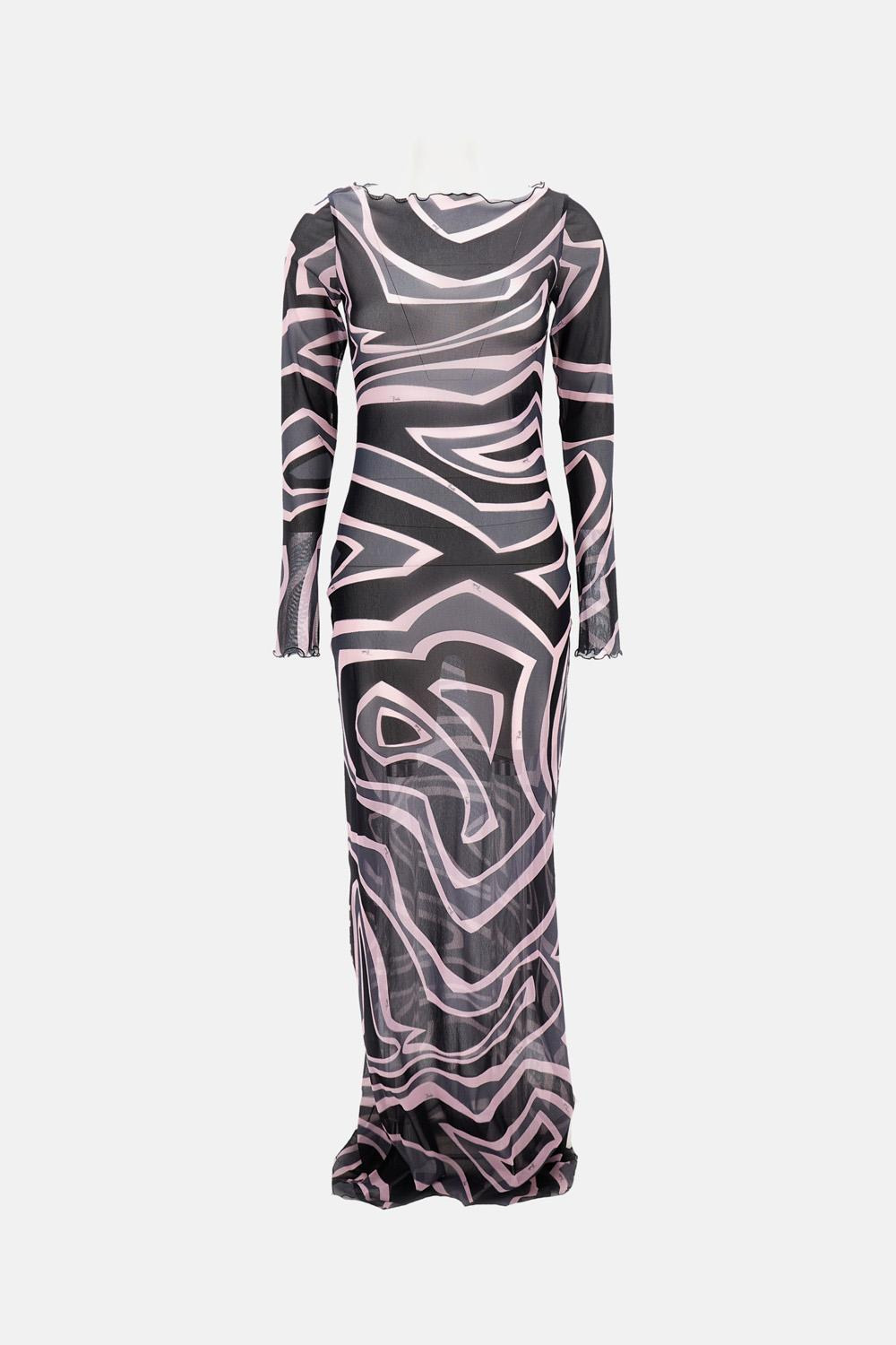 Long dress with long sleeves and boat neckline in transparent mesh printed with iconic psychedelic pattern. Made in Italy. Details and Care Color: Nero Composition: 100% POLIAMMIDE Made in: Italia Sku: 5UJI355U749047