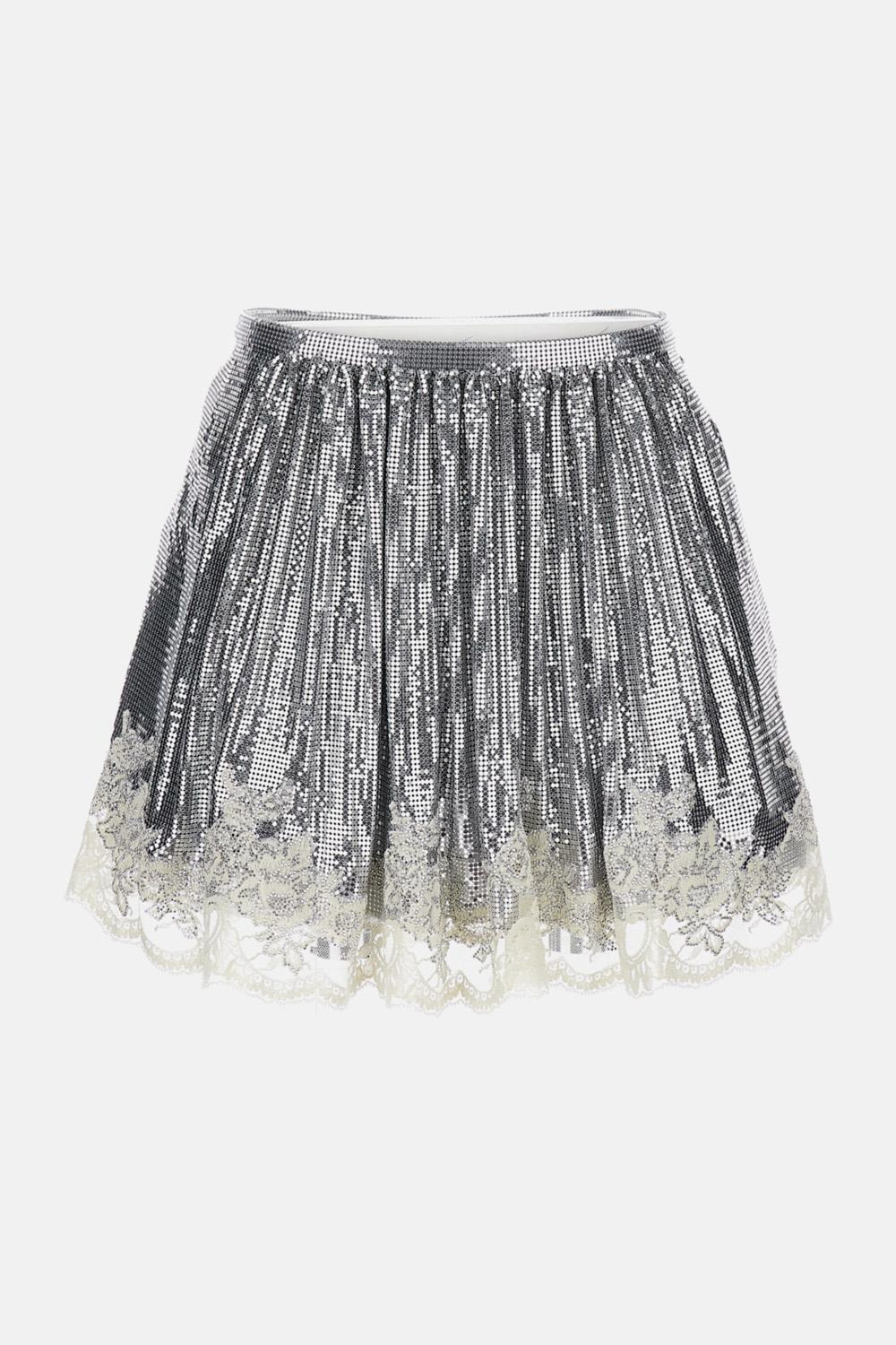Metallic mesh mini skirt with lace detail on the hem, button fastening Regular fit, silver colour Care and details Color: Silver Composition: 100% ALUMINIUM Made in: Cina Code: 25AIJU086MH0004P040