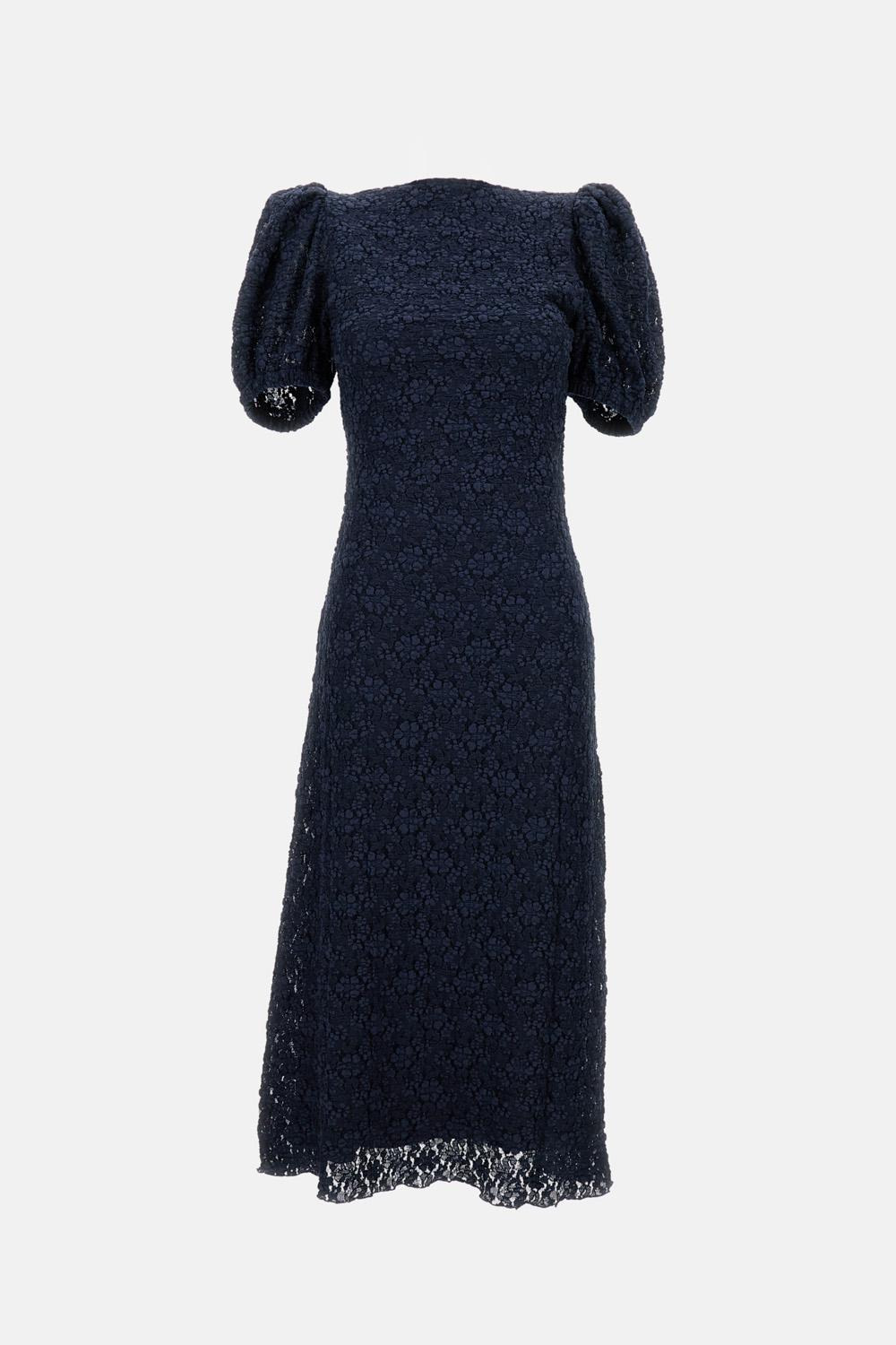 puff-sleeve lace midi dress