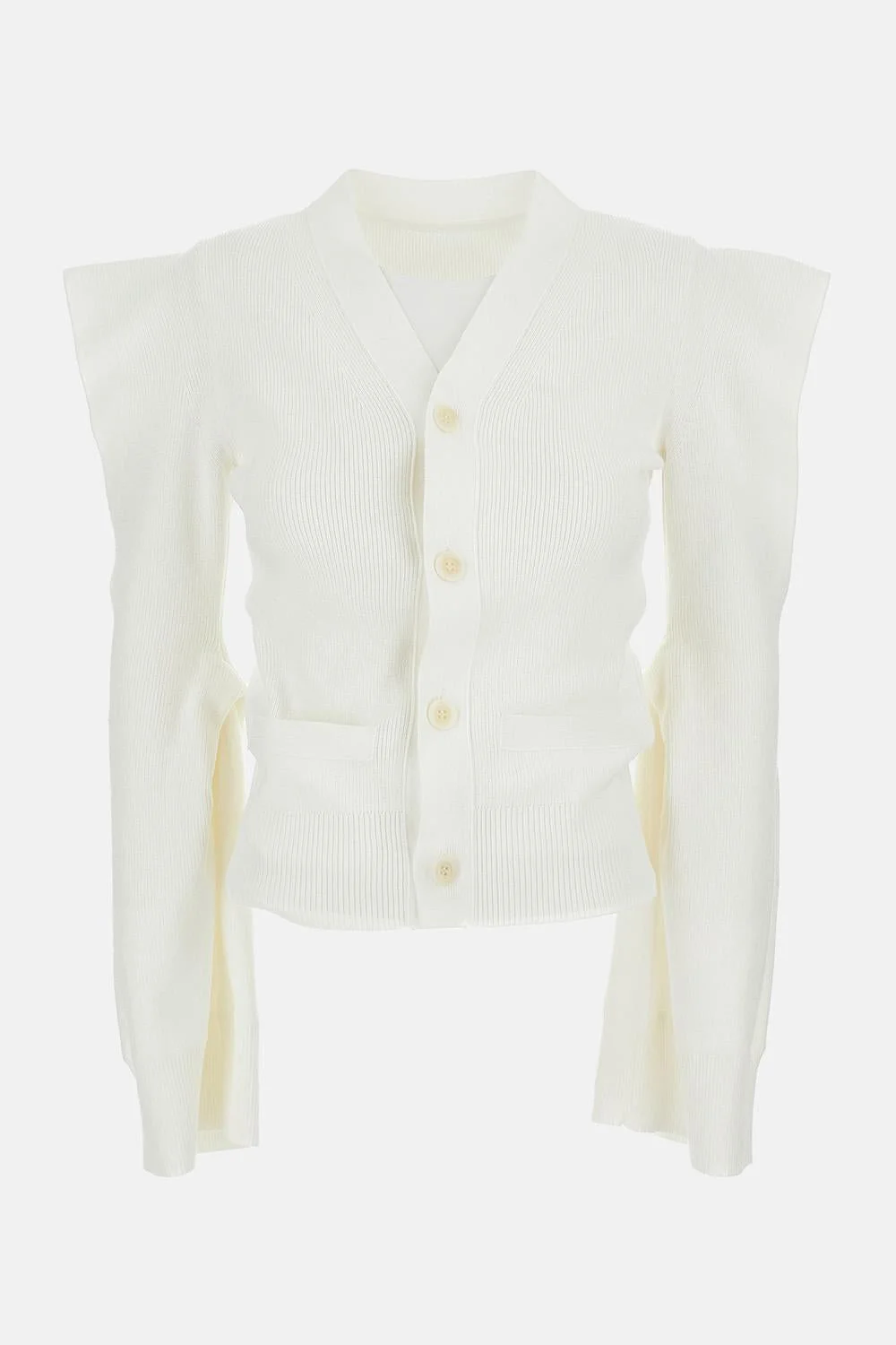 Structured knit cardigan Front button closure Slim fit with wide, asymmetric sleeves featuring a 'cut-out' detail Color: white. Details and Care Color: Bianco Composition: 57% CO 43% PL Made in: Giappone Sku: 2608335151
