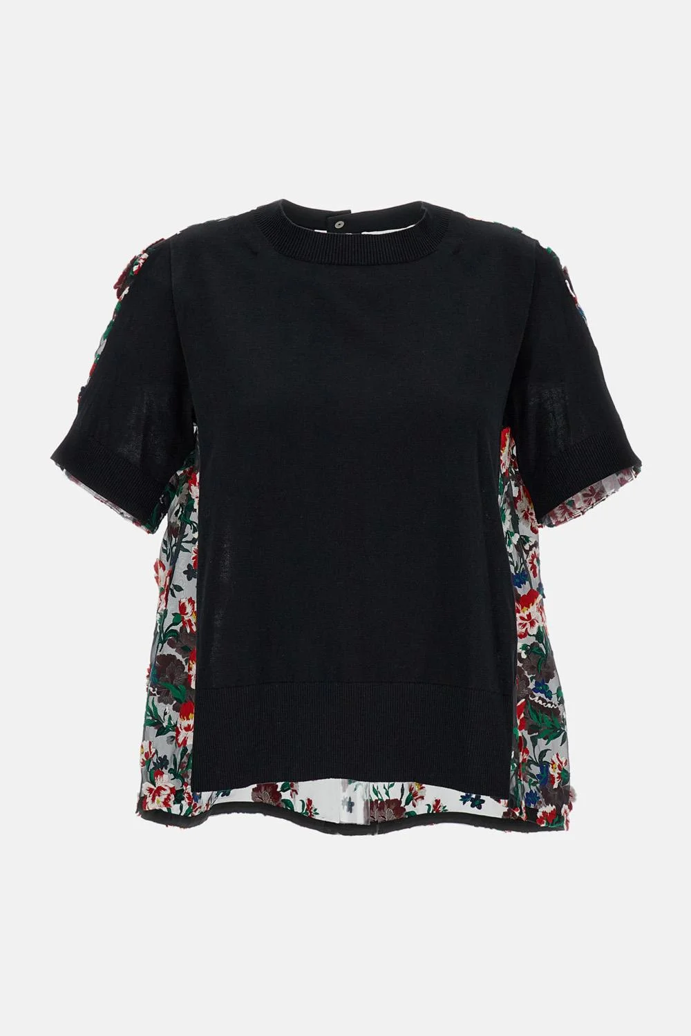 Two-panel constructed top Front: knit with ribbed neckline and trims Back: sheer panel with embroidered floral appliques Relaxed fit Flared silhouette Back closure with snap button Color: black \ multicolor Details and Care Color: Nero Composition: 33% CO 5% NY 2% PU Made in: Cina Sku: 2608533001