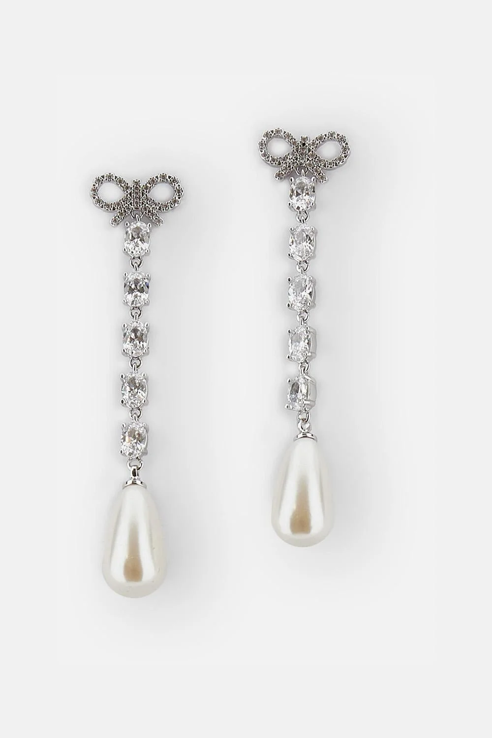 Bow-shaped drop earrings, adorned with crystals and a teardrop pearl. Details and Care Color: Argento Composition: 100% COPPER Made in: Hong Kong Sku: RS26609ESLSILVER