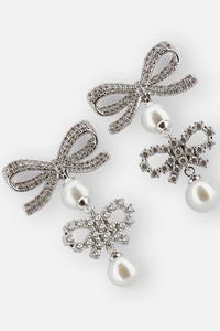 Double pendant silver bow earrings with crystals, interspersed with pearls. Post back closure. Details and Care Color: Argento Composition: 100% COPPER Made in: Hong Kong Sku: RS26629ESLSILVER