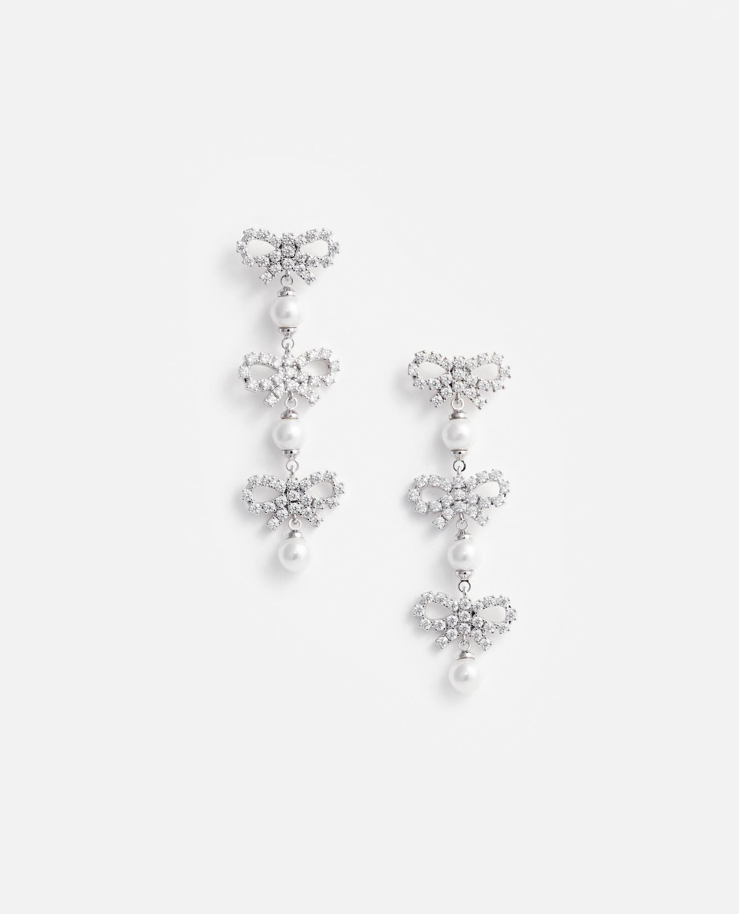 Drop earrings with crystals. Bows and pearls. Color: silver Care and details Color: White Composition: BRASS Made in: Hong Kong Code: PF25613EPPEARL
