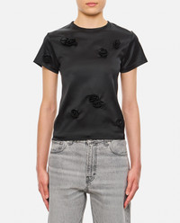 Sportmax women's short-sleeved Mendoza t-shirt. Slim fit t-shirt with fabric roses applied on the front and back. Black color and rear zip. Care and details Color: Black Composition: 74% PC 23% PA 3% EA Made in: Tunisia Code: 2422166021600003