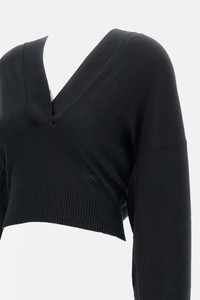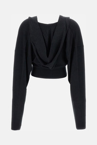 Soft knit sweatshirt made from a wool blend. V-neck and long sleeves. Integrated hood. Short length with ribbed edges. Pull-on style, made in Italy. Color: black Details and Care Color: Nero Composition: 89% VIRGIN WOOL 10% PA 1% LY Made in: Italia Sku: 6K10983S26101000
