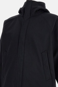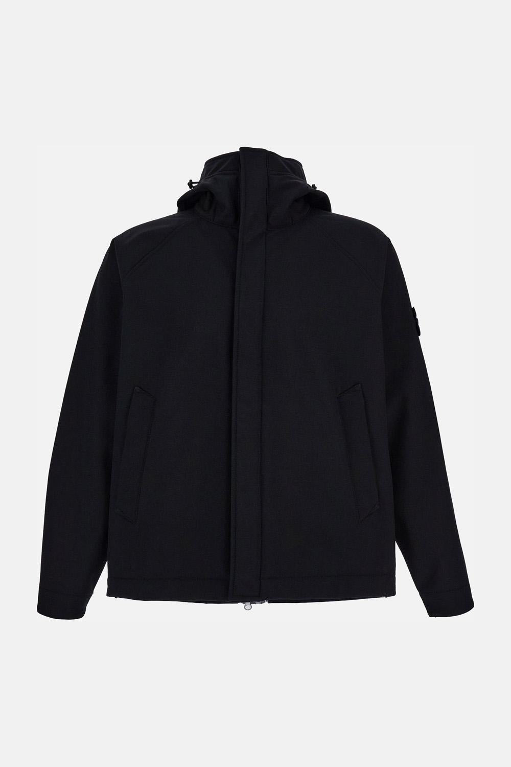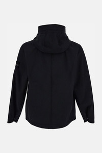 Jacket in Soft Shell e.dye® technical fabric. 100% recycled stretch polyester, water-repellent and breathable. Adjustable hood with drawstring and double front closure with zip and buttons. Side pockets with buttons. Iconic logo badge applied on the left sleeve. Black color. Details and Care Color: Nero Composition: 92% PL 8% EA Made in: Vietnam Sku: Q100010S0B22V0029