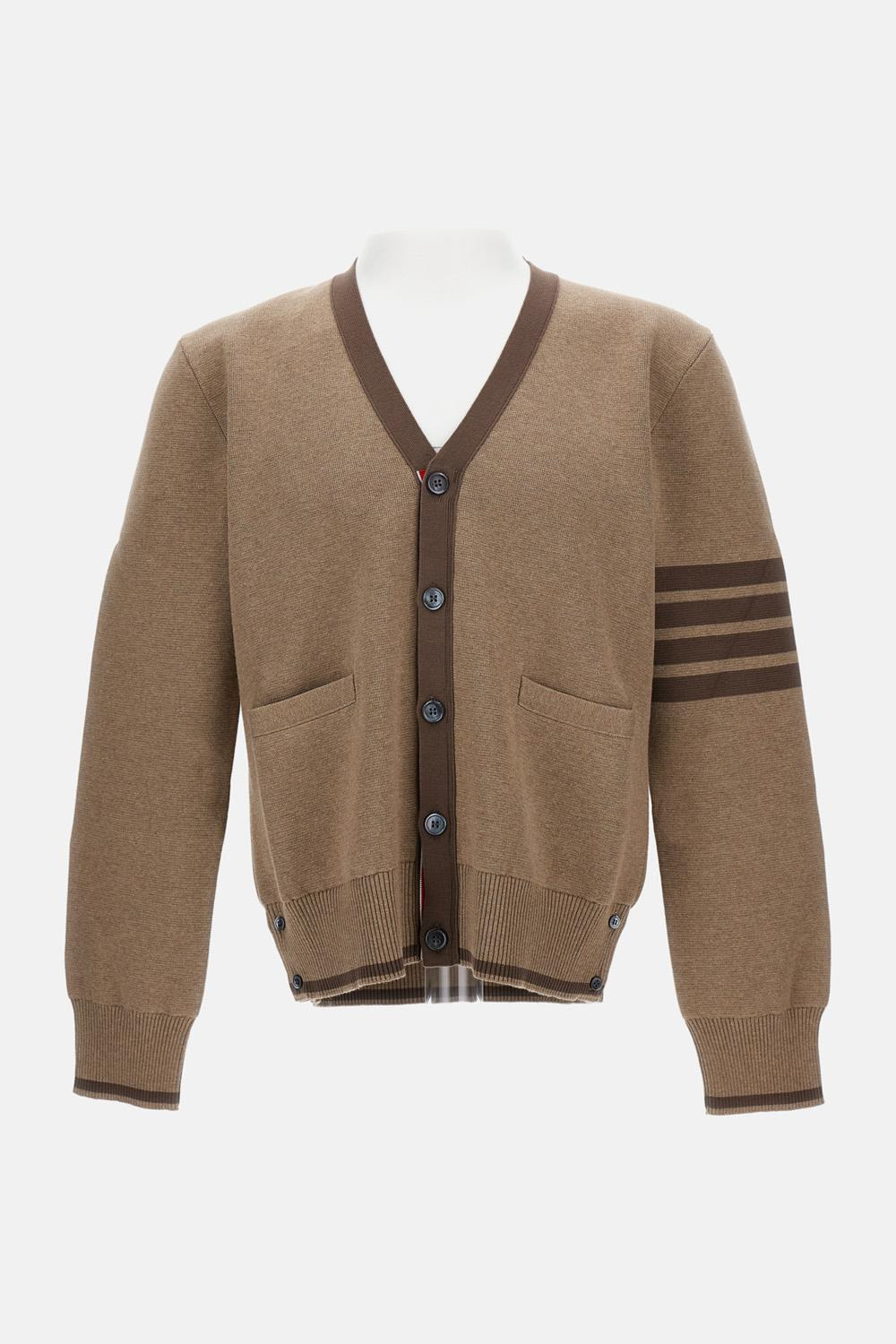 Cotton cardigan with V-neck and classic button fastening. Iconic 4 bars on sleeve. Regular fit. Made in Italy. Colour : beige Care and details Color: Beige Composition: 100% CO Made in: Italia Code: MKC171D00219215