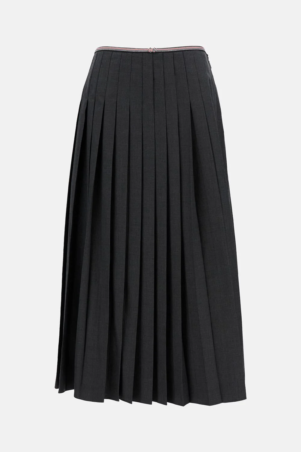 Skirt with tight pleats and calf-length Crafted from fine Super 120's wool twill Dynamic design with an asymmetrical hem Iconic tricolour grosgrain tab at the back Closure with invisible zip Colour: Grey Made in Italy Details and Care Color: Grigio Composition: 100% WO Made in: Italia Sku: FGCA22A00626025