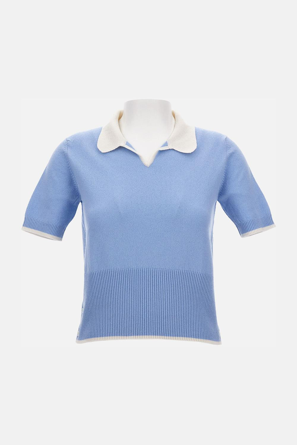 Wool polo shirt with drop and button closure. Round point collar. Details on white hem, regular fit. Light blue color Care and details Color: Sky blue Composition: 100% WS Made in: Regno Unito Code: FKP122AY2001472