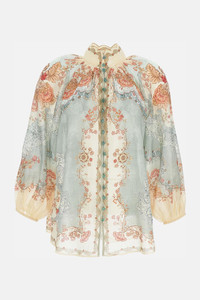 Ramie blouse featuring a high collar with scalloped edges, rouleau buttons along the center front, and long sleeves with elasticated cuffs. High collar with scalloped detail Placed print Designed for a relaxed fit. Lightweight, non-stretch fabric. This garment fits true to size. Details and Care Color: Multicolore Composition: 100% RA Made in: CHINA Sku: 4273TRS263WPFM
