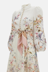 A midi linen dress featuring long puff sleeves with elasticated cuffs, functional buttons at the front, finished with a removable scarf belt. High collar Placed print Removable scarf belt Invisible zip closure at the center back Fully flared skirt Slightly fitted at the bust and waist, soft on the hips. Medium-weight fabric, non-stretch Details and Care Color: Beige Composition: 100% LI Made in: China Sku: 9143DC261CRMAV