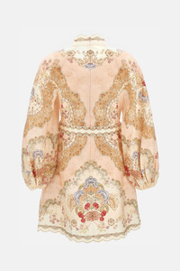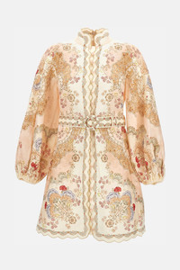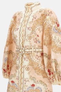 A mini dress in 'wallpaper floral blush' linen print, featuring a high collar, rouleau buttons down the front center, and long puff sleeves, finished with an invisible zipper closure at the center back. Removable fabric-covered belt at the waist with buckle Placed print Lined Fitted at the bust and waist, soft over the hips and legs This garment fits true to size. Details and Care Color: Multicolore Composition: 100% LI Made in: China Sku: 6470DRS263WPFB