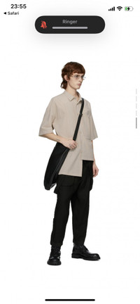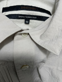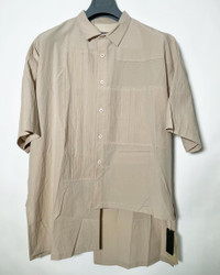 Short sleeve cotton poplin shirt in off-white Spread collar Button closure and pinched seam detailing at front Welt pocket at waist. Asymmetric drop-tail hem