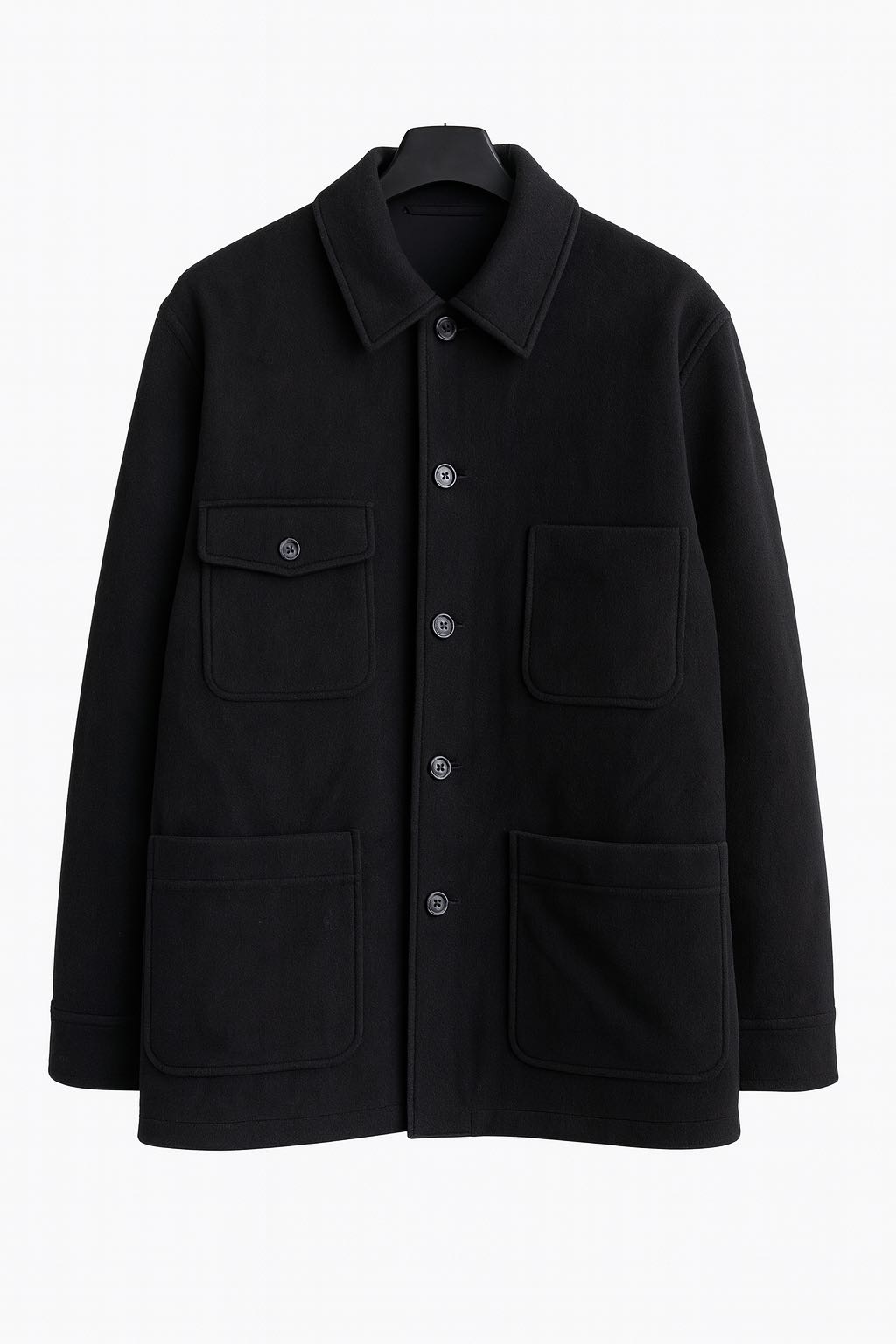 A minimalist black wool work jacket from Comme des Garçons Homme, dated AD1988. Features a clean button-front closure, classic pointed collar, and functional patch pockets that reference traditional European workwear. The silhouette is relaxed yet structured, typical of late-80s CDG Homme tailoring. The understated design highlights fabric quality and construction rather than branding, making it a timeless archival piece suitable for both casual and elevated styling. Material • Outer: 90% Wool, 10% Nylon • Lining: Cupra (100%) • Structured but soft hand feel • Dry clean only