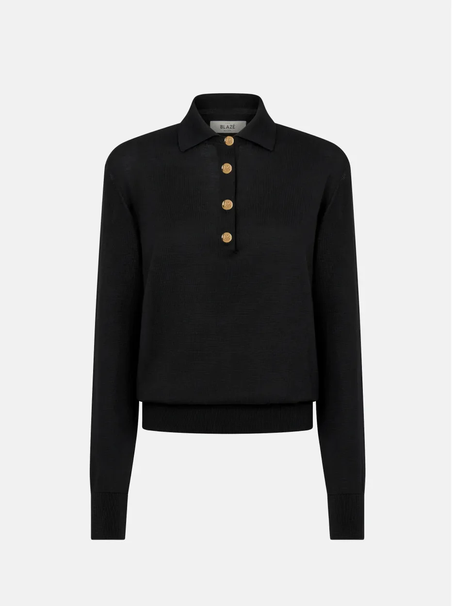 Women’s black silk-and-cotton polo BLAZE Knitwear introduces the Alegria Polo, finely knitted from a blend of silk and cotton. Featuring ribbed details, a classic straight collar, and the brand's seahorse crest-embossed buttons for a distinctive touch. Available in black, navy, wine, rust, and mint. - Straight point collar - Gold-tone metal logo buttons - Ribbed cuffs and hem 55% Silk 45% Cotton Made in Italy