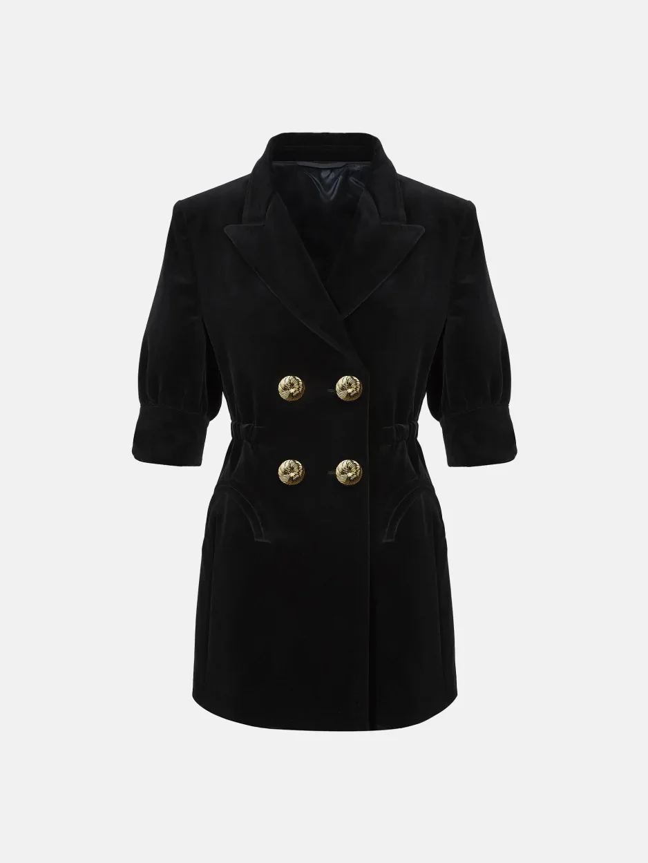 Black velvet mini dress A minidress in sumptuous black velvet with an elasticated cinched waist and subtly padded shoulders that accentuate its classic hourglass silhouette. Full short sleeves, a v-neckline, classic lapels and oversized gilded buttons embossed with the brand’s logo complete this statement dress. - Fitted at the bodice and waist, relaxed over the hips - Lightly padded shoulders and puff sleeves - Elasticated waist - Navy internal lining - Gold-tone brass buttons - Peak lapels - External Smiley pockets 100% Cotton Lining: Viscose Made in Italy