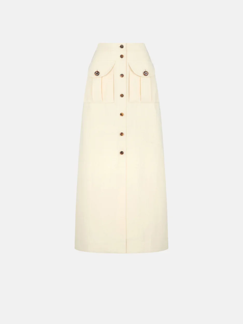 Buttoned-up midi skirt in linen and silk cream In buttery white linen, the high-waisted Savannah Appaloosa Skirt gently drapes to the calf. It features two handy Smiley pockets and glossy loden buttons down the front, leading to a leg-freeing slit, and pairs with the Pekin Shirt for a complete look. - High-rise, designed for a slim fit - Glossy loden buttons - Button fastenings along front - Smiley patch pockets 59% Linen 41% Silk Made in Italy