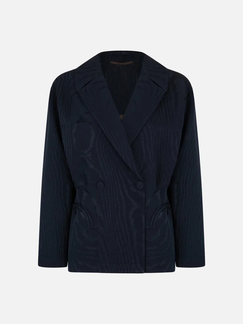 Double-breasted oversized navy watered viscose blazer A slightly fitted single-breasted blazer in dark blue cotton/viscose moire with a wide collar and lapels and covered buttons. - Regular fit - Fitted waist - Lightly padded shoulders - Peak lapels - External Smiley pockets and one internal pocket 55% Viscose 45% Cotton Lining: 100% Viscose Made in Italy