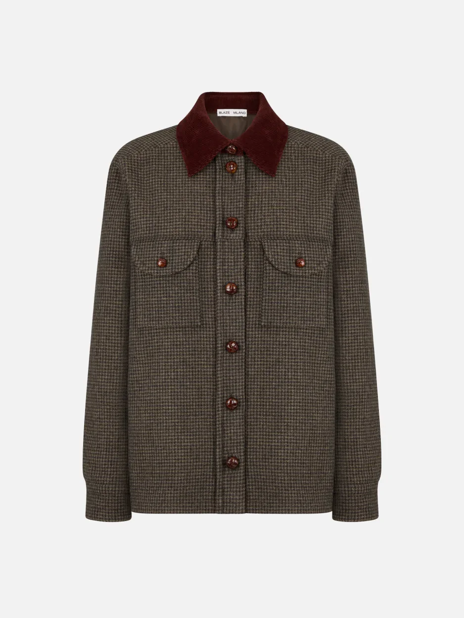 Women’s oversized houndstooth wool jacket Cut for a relaxed fit and perfect for the transitional season, BLAZE Milano’s Badis Berber Jacket is defined by refined details: an earthy-toned houndstooth pattern, a contrasting burgundy corduroy collar, lacquered leather loden-effect buttons, and two generous chest pockets. Oversized yet balanced, it blends sporty ease with polished sophistication — an ideal companion for autumn escapes. - Single-breasted - Oversized fit - Corduroy collar - Sleeves with buttoned cuffs - Lacquered leather loden-effect buttons - Two chest flap pockets with button closure - Dark chocolate lining with logo motif 85% Wool 15% Polyamide Lining: Viscose Made in Italy