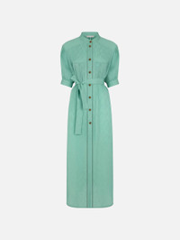Long shirt dress in aqua green silk with textured pattern Inspired by the crystal-clear waters of the Cote d’Azur, the Neptune fabric dresses the Berber Long Dress in a luminous aqua green hue. Crafted from lightweight silk, it features a knotted waist belt, tortoiseshell buttons and a stand collar, creating a fresh, airy style with a soft romantic allure. - Oversized fit - Floor-length - Mandarin collar - Front button fastening with amber-toned tortoiseshell buttons featuring an engraved logo - Short sleeves with button fastening - Fixed waist belt in matching fabric - Tortoiseshell-effect buttons - Two chest pockets with central pleat and embroidered logo on the left side 100% Silk Made in Italy