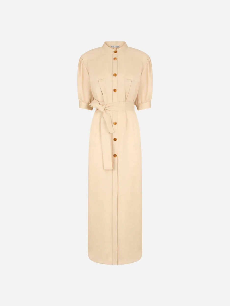 Long shirt dress in champagne viscose and hemp The Donzi Berber Long Dress channels understated elegance with a subtle safari-inspired spirit. Crafted from a fresh blend of viscose and hemp in a champagne hue, it features a relaxed fit and a feminine silhouette shaped by buttoned sleeves at the elbow, a knotted waist belt, and amber-toned buttons that define the front closure. Perfect from day to evening. - Oversized fit - Floor-length - Mandarin collar - Front button fastening with amber-toned tortoiseshell buttons featuring an engraved logo - Short sleeves with button fastening - Fixed waist belt in matching fabric - Tortoiseshell-effect amber-toned buttons with engraved logo - Two chest pockets with central pleat and embroidered logo on the left side 68% Viscose 32% Hemp Lining: Viscose Made in Italy