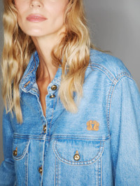 Women’s light blue denim shirt A washed-effect denim shirt-jacket with appliqued Smiley pockets on the front. Gilded loden-effect buttons and contrasting rust-colored stitching. - Mini loden-inspired metal buttons - Straight-point collar - Smiley chest pockets 100% Cotton Made in Italy