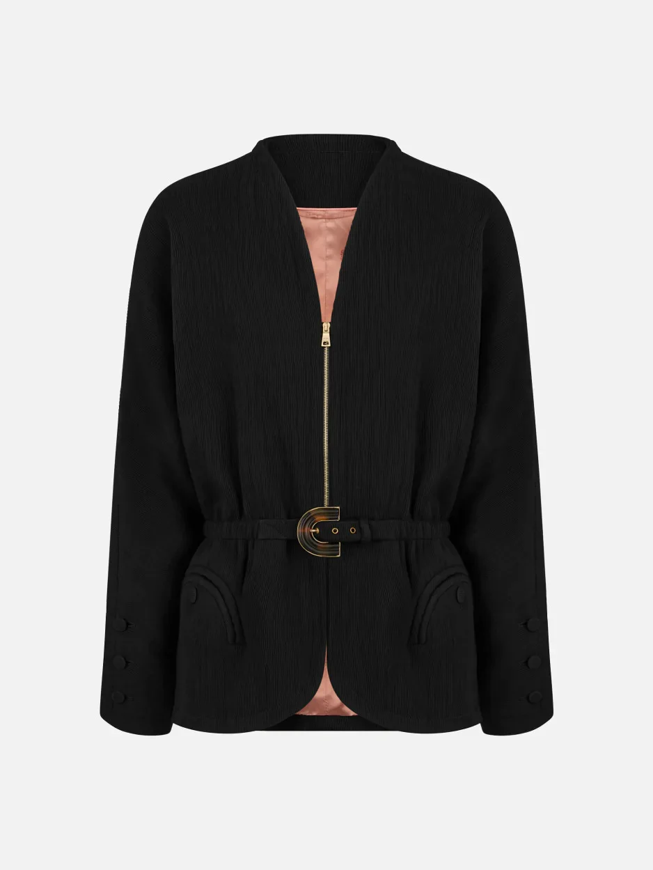 Women’s black micro-pleated viscose jacket with zip and belt A standout new entry for Resort 2026, the Carol Jacket in micro-pleated viscose plays with the contrast between tailored blazer and sporty outerwear. The silhouette recalls a blazer, cinched at the waist with an elastic belt featuring a tortoiseshell buckle inspired by the brand’s iconic Smiley Pocket shape; the ribbed viscose adds an elegant texture, while the front zip and V-neckline without lapels nod to casualwear. A versatile piece designed to suit any occasion. - Slim fit - V-neck - Gold-tone zip fastening - External Smiley pockets, two internal pockets - Adjustable elastic waist belt with tortoiseshell-effect buckle with gold-plated brass base - Fabric-covered buttons - Rose lining with logo motif 90% Viscose, 10% Polyamide Lining: Viscose Made in Italy
