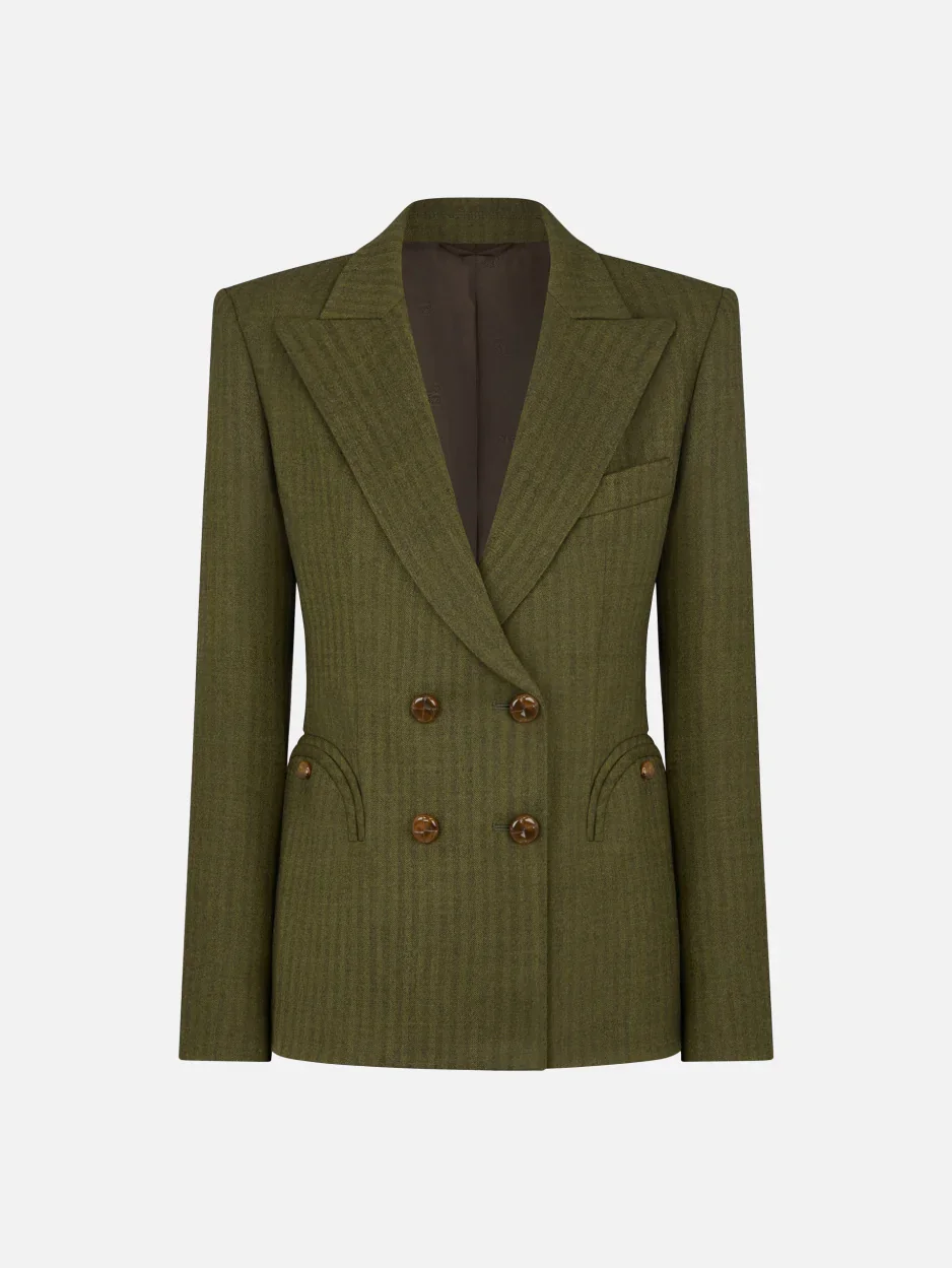 Women’s double-breasted hourglass blazer in olive green wool The Anouk Green Charmer double-breasted blazer reinterprets one of BLAZE Milano’s signature designs – feminine and elegant thanks to its distinctive hourglass silhouette that accentuates the waistline – in a sophisticated autumnal version crafted from olive green wool. The micro-chevron pattern creates a subtle tone-on-tone pinstripe effect, making this jacket perfect from day to evening, whether worn as a separate or paired with the matching Nana Pants. - Double-breasted - Hourglass shape - Slim fit - Lightly padded shoulders - Tortoiseshell-effect loden-effect buttons - External Smiley pockets and one internal pocket - Dark chocolate lining with logo motif 98% Virgin wool 2% Elastane Lining: Viscose Made in Italy
