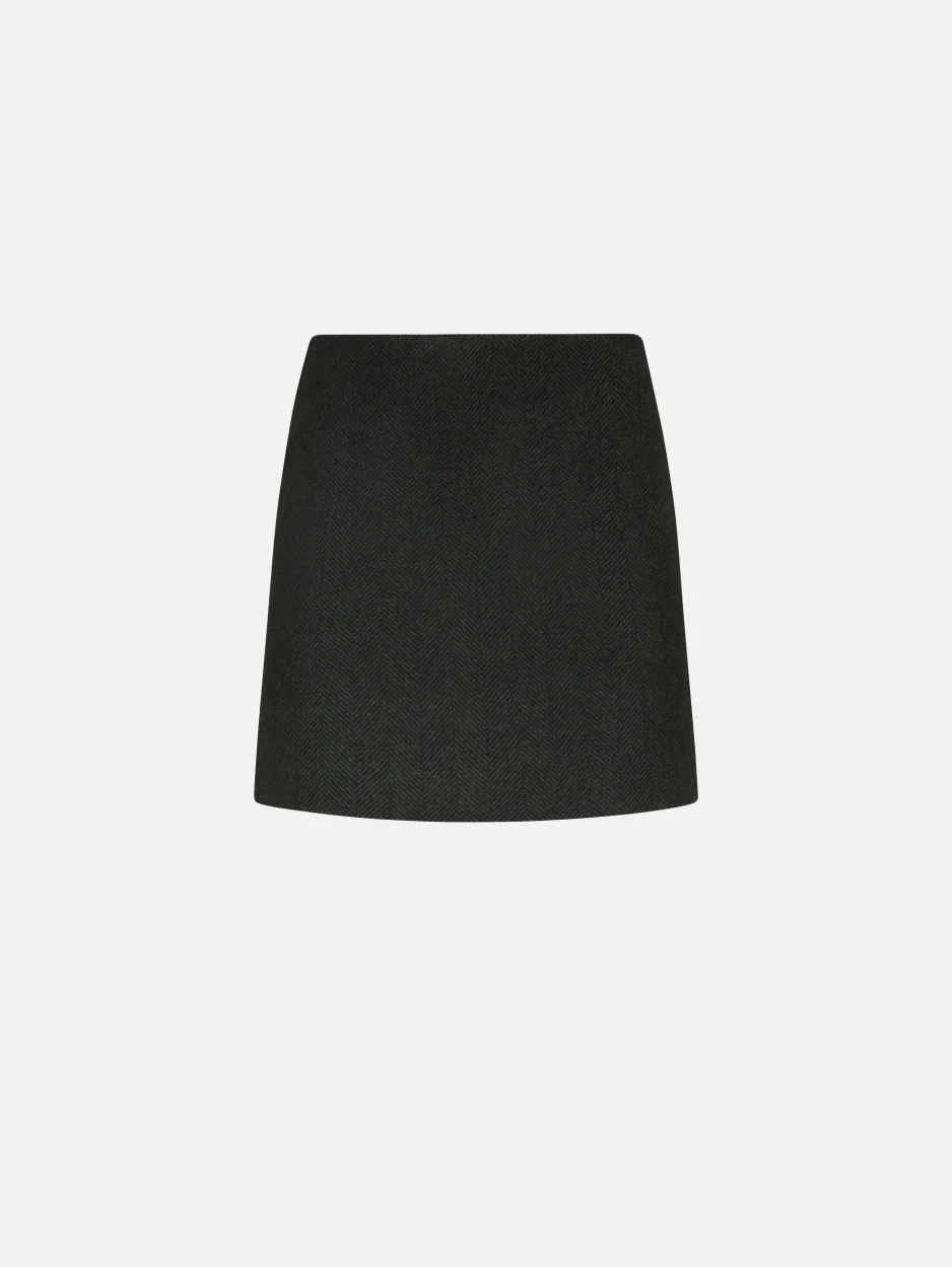 Women’s dark green herringbone wool mini skirt Among BLAZE Milano’s signature designs, the Coci mini skirt is presented for Fall Winter 2025 in one of the key textures of the season: a fine herringbone wool in a deep dark green shade. Perfectly paired with the matching Cheveyo Everynight Blazer, it creates a women’s ensemble embodying a bold, contemporary femininity that transitions seamlessly from office hours to off-duty moments. - Mini length - High-rise - Slim fit - Concealed zip fastening along back - Decorative back Smiley pocket - Dark chocolate lining with logo motif 100% Virgin wool Lining: Viscose Made in Italy