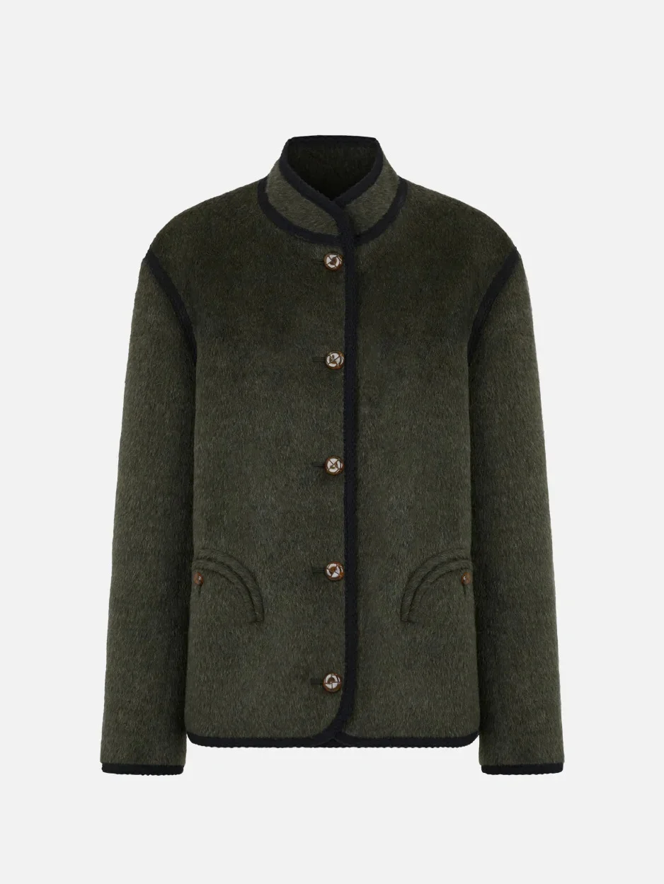 Women’s stand-collar jacket in dark green wool and mohair with furry finish Crafted from wool and mohair with a faux-fur effect, the Thanks Dad Curly Jacket completes cold-season looks with effortless style. The stand collar and contrast cotton trims define its clean, contemporary lines, while tortoiseshell loden-effect buttons and the signature Smiley pocket add BLAZE Milano’s iconic touch. A refined piece that can also be paired with the matching Coci Mini Skirt. - Regular fit - Stand-collar - Contrast cotton trims - Tortoiseshell-effect loden-effect buttons - External Smiley pockets 50% Mohair 45% Virgin wool 5% Polyamide Lining: Viscose Made in Italy