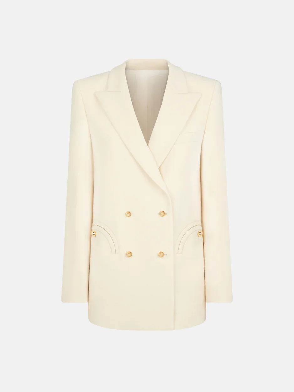 Double-breasted wool white blazer The Everyday Blazer, BLAZE Milano’s hero product, is here worked in cream white, which makes it not only very versatile but also hyper chic. - Double-breasted - Fits true to size with lightly padded shoulders - Tailored for a straight cut through the waist - Cream coloured lining - Golden buttons - Peak lapels - Single back vent - Smiley outer pockets and four internal pockets 100% Virgin Wool Lining: 100% Viscose Made in Italy