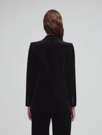 Double-breasted black velvet blazer with silk trimming A tailored double-breasted blazer in sleek midnight-black velvet with a clean, straight silhouette and peak lapels. The Smiley pocket detailing, buttons and lapels are in contrasting matte black silk. - Double-breasted - Straight cut - Black lining - Silk buttons - Silk peak lapels - External Smiley pockets and four internal welt pockets 100% Cotton Linings: Viscose Made in Italy