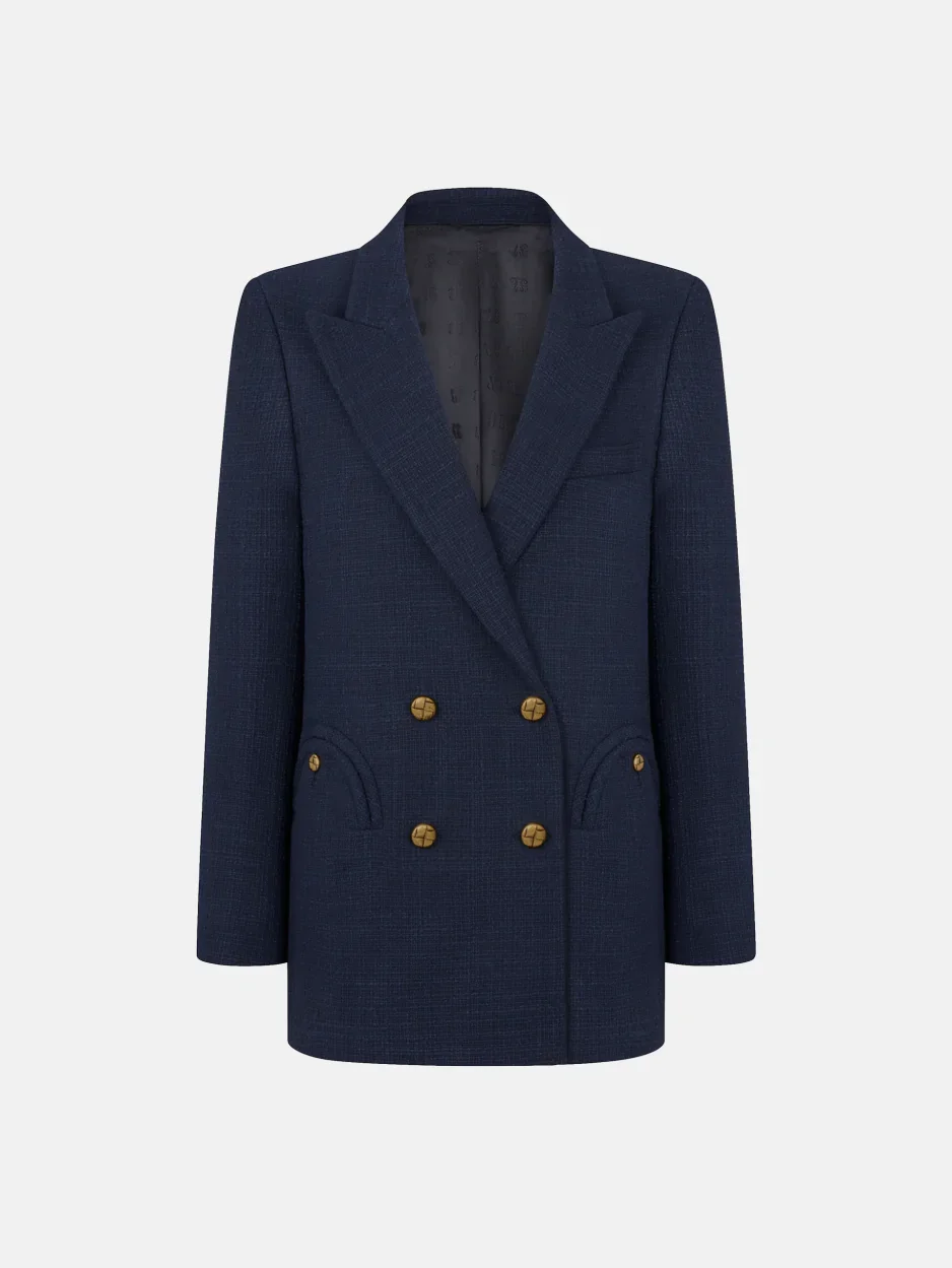 Double-breasted oversize cotton tweed navy blazer The double-breasted Missy blazer has a boxy cut – it’s a slightly-more-oversized version of Everynight, with lightly padded shoulders and glossy brown buttons. For the Pre Fall collection it comes in a lightweight navy-blue cotton blend that’s perfect from the office to evening year-round. - Double-breasted - Oversized cut - Lightly padded shoulders - Navy lining - Shiny loden-inspired buttons - Peak lapels - External Smiley pockets and four internal welt pockets 68% Cotton 27% Polyester 5% Other Fibers Lining: 100% Viscose Made in Italy