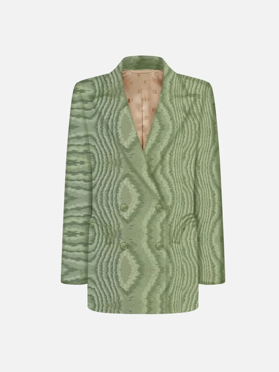 Women’s oversized double-breasted blazer in sage green moire viscose Among BLAZE Milano’s signature styles, the Everynight Blazer is reimagined in a sophisticated sage green moire viscose — a fabric with a distinctive finish that creates an undulating, light-catching effect. A double-breasted piece with refined allure, it can be styled with the matching Sussex Longuette or worn as a separate to elevate even the most essential looks. - Double-breasted - Slightly oversized fit, boxy design - Lightly padded shoulders - Peak lapels - Side vents - Fabric-covered buttons - External Smiley pockets and one internal pocket - Camel lining with logo motif 55% Viscose 45% Cotton Lining: Viscose Made in Italy