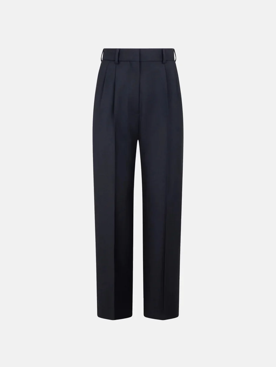 Pleated straight-leg wool and mohair navy pants Crafted from a light wool-mohair blend in classic navy blue, the First Class Navy Fox Pants feature a high-rise, straight-cut design and a single Smiley back pocket. Ideal as an office-ready suit when paired with the matching blazer. - High-rise, tailored for a straight-leg fit - Front pleats - Belt loops - Concealed zip and hook fastening - Smiley back pocket 71% Virgin Wool 29% Mohair Made in Italy