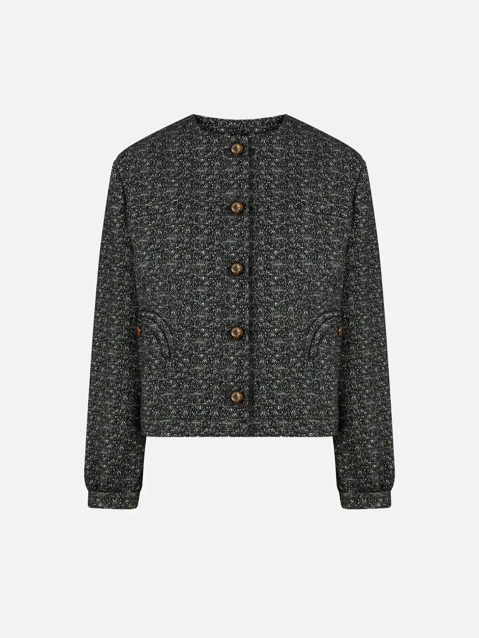 Women’s black-and-white melange bolero jacket One of BLAZE Milano’s best-selling styles, the Gliss Bolero takes on a boho-chic allure in this black-and-white melange version, complete with the signature Smiley Pockets and loden-effect buttons. Paired with the coordinating Teke Shorts, it creates a look that’s both playful and sophisticated. - Oversized, bomber-like fit - Lightly padded shoulders - External Smiley pockets and two chest slit pockets - Sleeves with buttoned cuffs - Tortoiseshell-effect loden-effect buttons - Black lining with logo motif 87% Cotton 13% Polyester Lining: Viscose Made in Italy