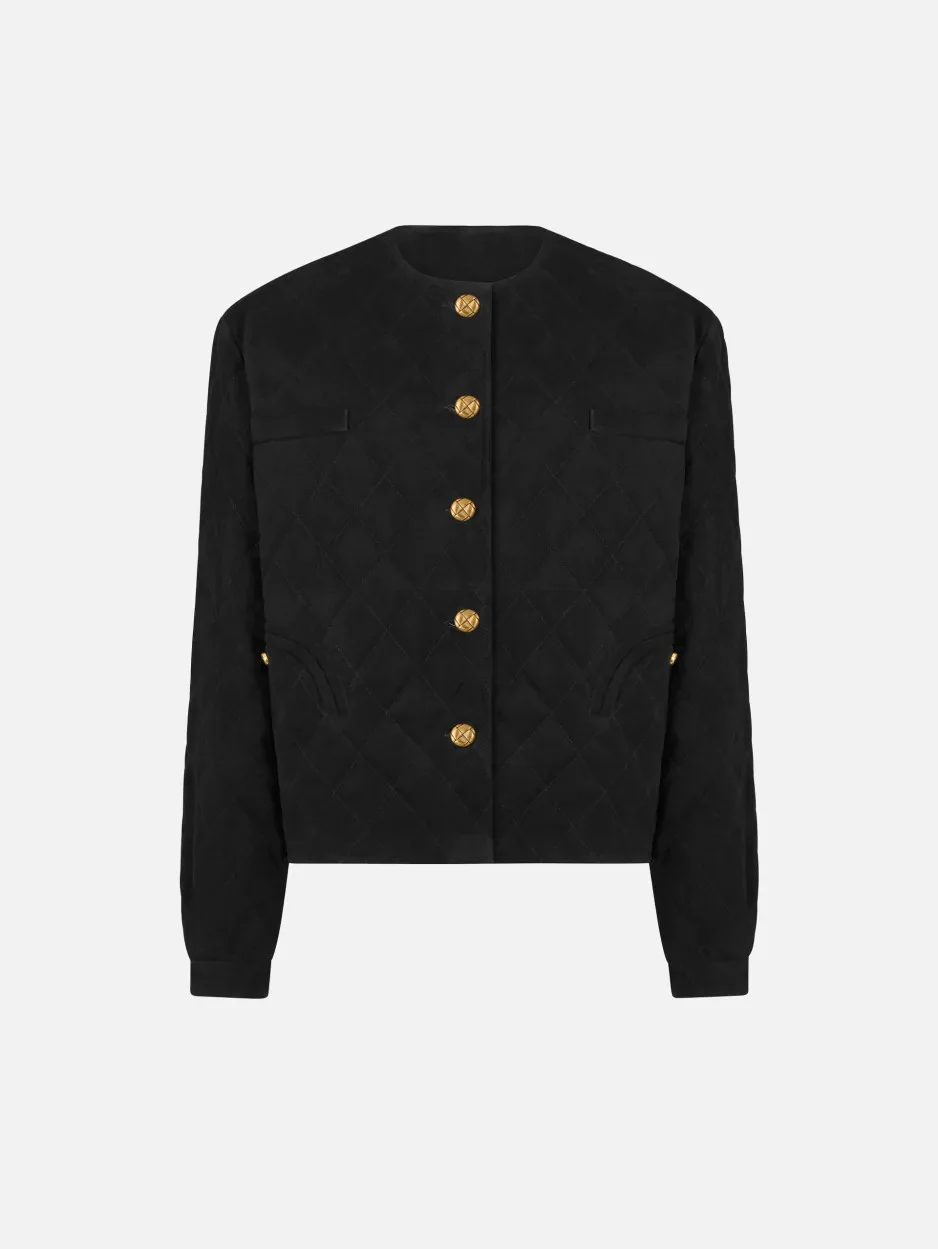 Women’s black quilted suede bolero jacket Among BLAZE Milano’s most beloved styles, the Gliss Bolero takes on a sophisticated attitude in this new black quilted suede version. The Smiley Pockets and gold loden-effect buttons add the brand’s unmistakable signature touch. Ideal for elevating both everyday outfits and evening ensembles, it pairs perfectly with the Viva Black Coci Miniskirt. - Oversized, bomber-like fit - Lightly padded shoulders - External Smiley pockets and two chest slit pockets - Sleeves with buttoned cuffs - Gold-tone loden-effect buttons - Black lining with logo motif 100% Lambskin Lining: Viscose Made in Italy