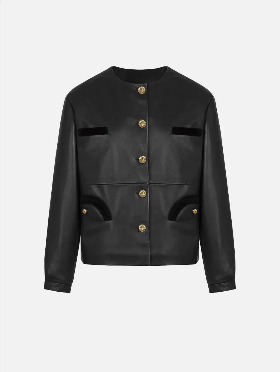 Oversized black velvet-trimmed lamb leather bolero jacket BLAZE Gliss Bolero showcases a relaxed bomber-like fit, crafted this season from virgin wool in sharp salt and pepper shades. It features a black velvet trim and elegant gold-toned buttons, adorning its lapel-less front. - Laidback bomber-like fit with lightly padded shoulders - Cuts at the hips - Velvet contrast piping - Navy coloured lining - Loden-inspired metal buttons - Smiley outer pockets and one internal pocket 100% Lamb Leather Lining: 100% Viscose Made in Italy