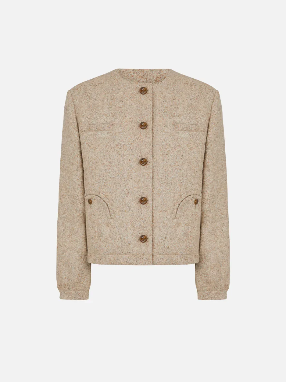 Oversized wool and alpaca beige bolero jacket This bolero jacket has an oversized fit – in fact, it fits a size larger, like all Gliss Bolero models. In a beige virgin wool/alpaca blend, this warm, soft jacket has lightly padded shoulders and loden-effect buttons. - Relaxed bomber-style fit - Lightly padded shoulders - Cut above the hips - External Smiley pockets and one internal pocket 66% Alpaca 34% Virgin Wool Lining: 100% Viscose Made in Italy