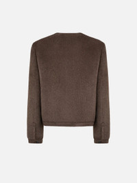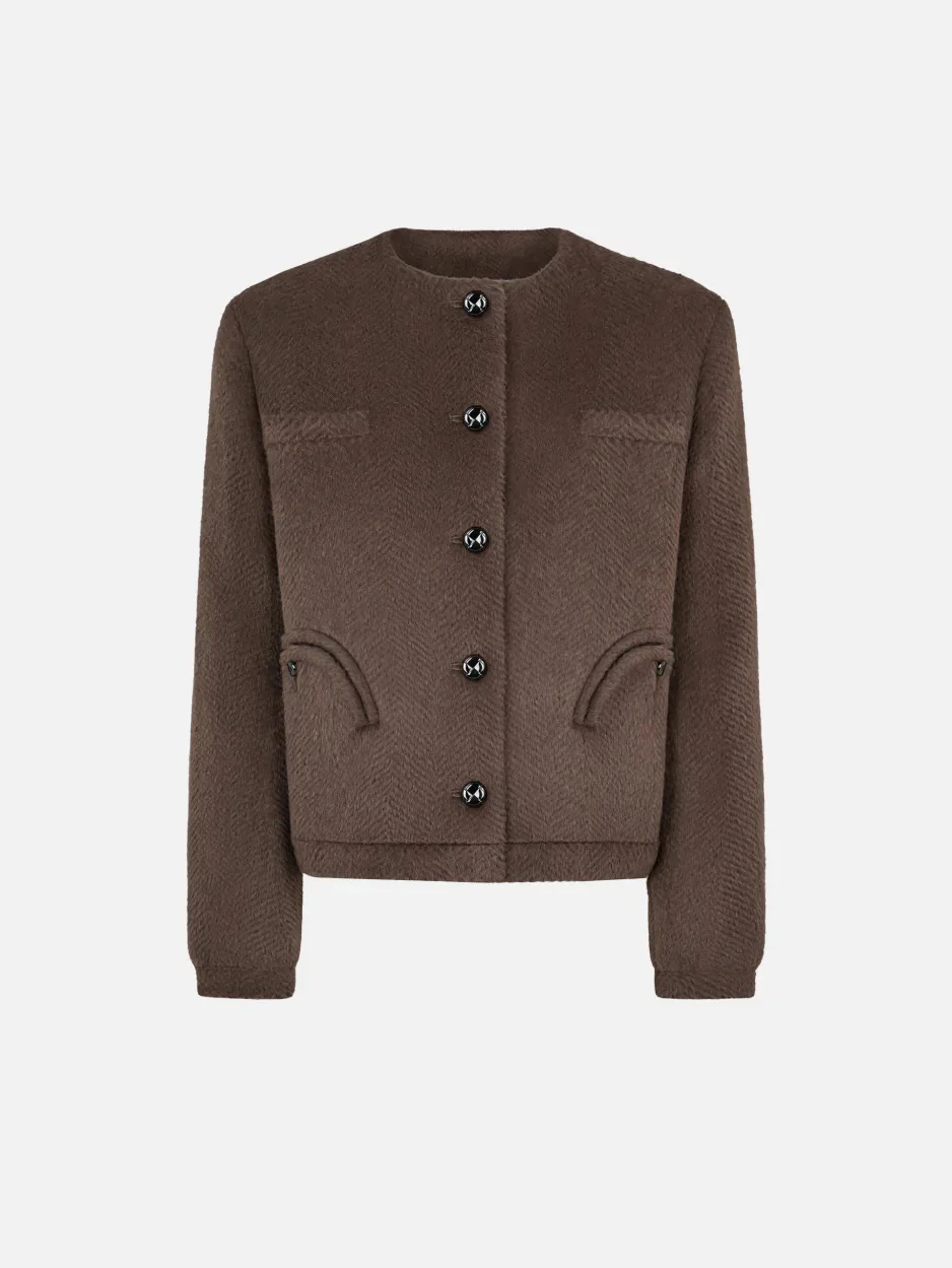 Women’s bolero jacket in brown chevron fabric with furry finish Chic yet comfortable, the This Is It Gliss Bolero stands out for its soft-hand alpaca and wool chevron fabric and warm chocolate hue. An ideal layer to wear over jeans and a turtleneck, or paired with the matching Coci Mini Skirt for an elegant ensemble with a retro twist. - Oversized, bomber-like fit - Lightly padded shoulders - Sleeves with buttoned cuffs - Black loden-effect buttons - Smiley pocket and chest slit pockets - Dark chocolate lining with logo motif 65% Alpaca 35% Virgin wool Lining: Viscose Made in Italy