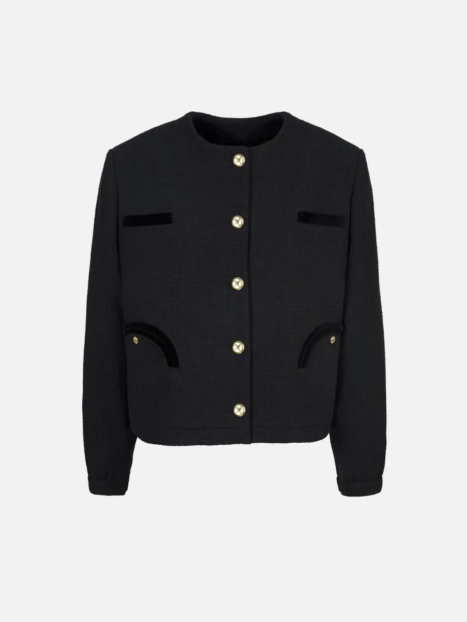 Oversized cotton tweed black bolero jacket This bolero jacket is BLAZE’s fresh and forever chic take on the traditional dancing jacket. Take the classic bolero, add some bomber attitude and two smiley pockets and voila! Cut at the hips and worked in a loose-knit black cotton blend, its gold buttons can be buttoned all the way to the lapelless collar. Wear this versatile piece night or day, dressed up or down, edgy or elegant: it will adapt to your personal style. - Laidback bomber-like fit with lightly padded shoulders - Cuts at the hips - Velvet contrast piping - Navy coloured lining - Loden-inspired metal buttons - Smiley outer pockets and one internal pocket 68% Cotton 27% Polyester Lining: 100% Viscose Made in Italy