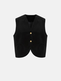 Black velvet vest The Jealousy Black Gliss Gilet features a lightly loose, curved fit in plush velvet, with a minimalist design enhanced by bold gold buttons at the front. It can be teamed with the matching Fox pants for an all-black affair. - Tailored for a slightly loose fit - Gold-tone brass buttons - Smiley outer pockets 100% Cotton Lining: 100% Viscose Made in Italy